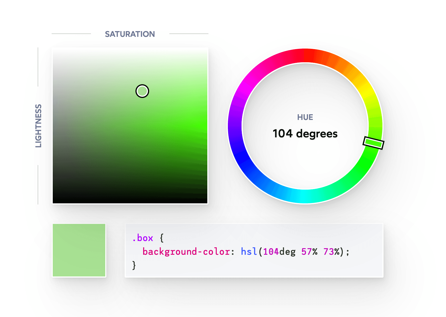И это кажется очень интуитивно-понятным способом задать цвет. Вместо прямого управления красно-сине-зелёными лампочками мы переместились на более высокий уровень абстрации, более близкий к тому, как люди обычно представляют цвета.