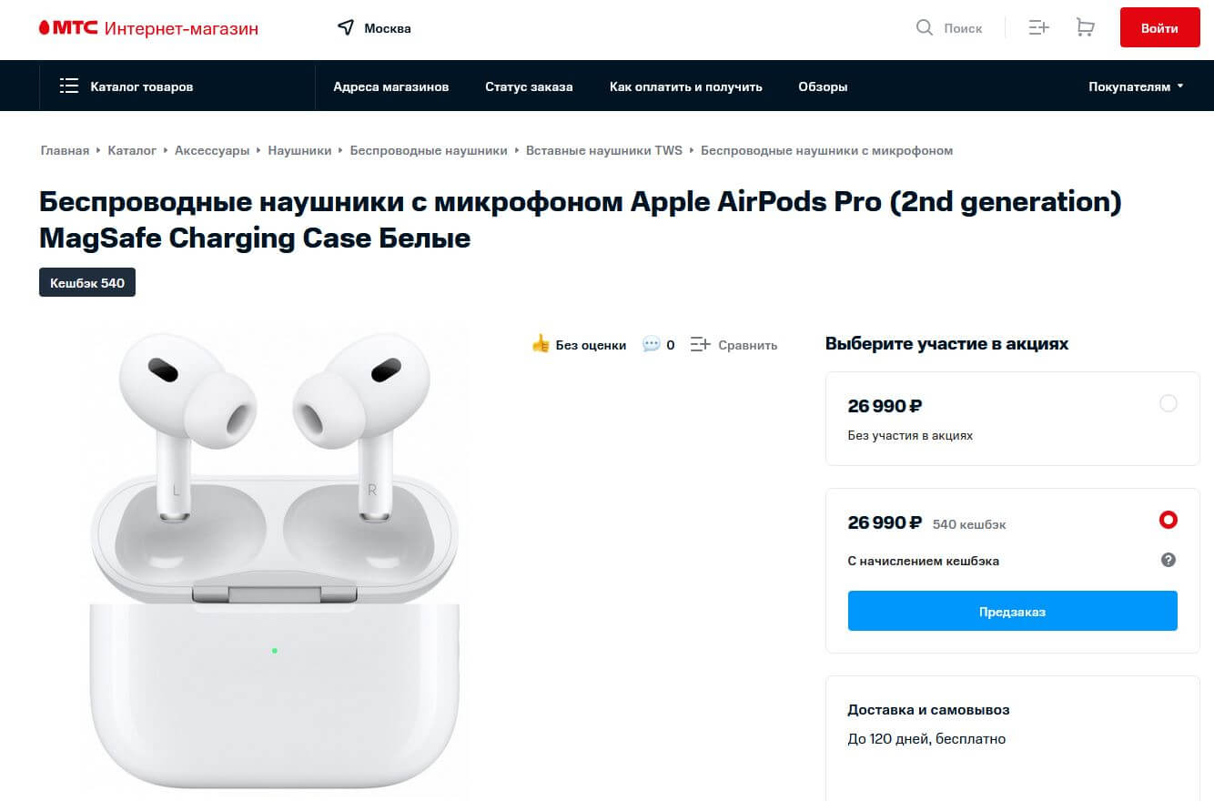 AirPods Pro 2 доступны для предзаказа с 9 сентября, а уже с 23 сентября поступили в продажу по всему миру. В американской рознице они будут стоить 249 долларов, а в России обойдутся в 26 990 рублей по предзаказу от МТС. Условия, кстати, очень заманчивые: кэшбэк, возврат денег, гарантия 12 месяцев. Однако у серовозов прямо сейчас можно купить AirPods Pro 2 за 20 000 рублей и даже дешевле.