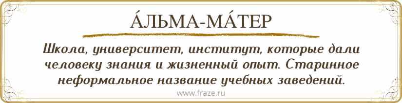 Альма-матер — латинское выражение, что буквально означает «питательница». Это термин, который используется для обозначения университета или колледжа, в котором прошли свое обучение выпускники. Правильное произношение этого слова — альма-матэр.
