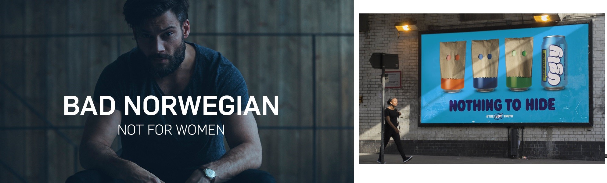 Примеры рекламы с негативными названиями (косметическая марка Bad Norwegian (Плохой норвежец), безалкогольные напитки Ugly (Уродливый))
