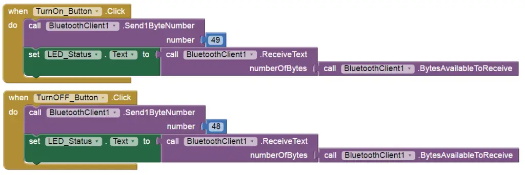 Далее нам нужно оживить две кнопки. Поэтому, когда будет нажата кнопка «TurnOn_Button», мы будем использовать клиентскую функцию Bluetooth «Send1ByteNumber» для отправки номера в модуль Arduino Bluetooth. В нашем случае это число 49, которое соответствует символу «1» в соответствии с таблицей ASCII и включает светодиод. Сразу после этого мы воспользуемся функцией BluetoothClient «ReceiveText» для получения входящей строки, которая отправляется обратно с Arduino на телефон. Эта строка имеет значение метки «LED_Status».