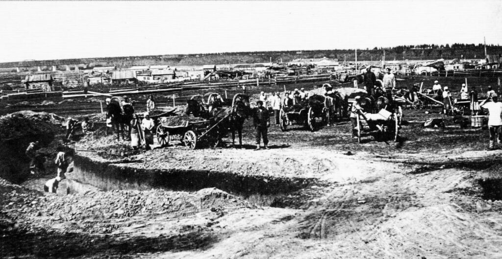 Начало строительства одного из цехов АТЗ, 1934 год. На фоне – отстроенные времянки, слева вдалеке виднеется железнодорожный мост через Томь. Фото: архив музея истории завода “Химпром”