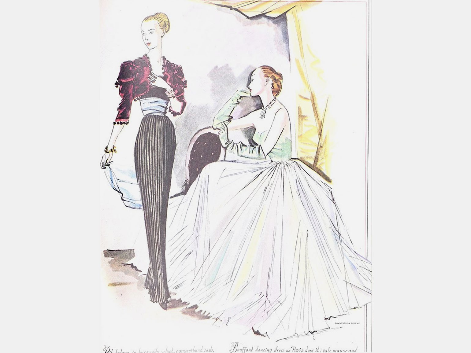 Эскиз в модном журнале 1947 года. Модель слева описана так: «Болеро в рубчик из бордового бархата, широкий пояс-шарф, узкая плиссированная юбка по щиколотку; выразительная мода от Balenciaga»Изображение: Public Domain