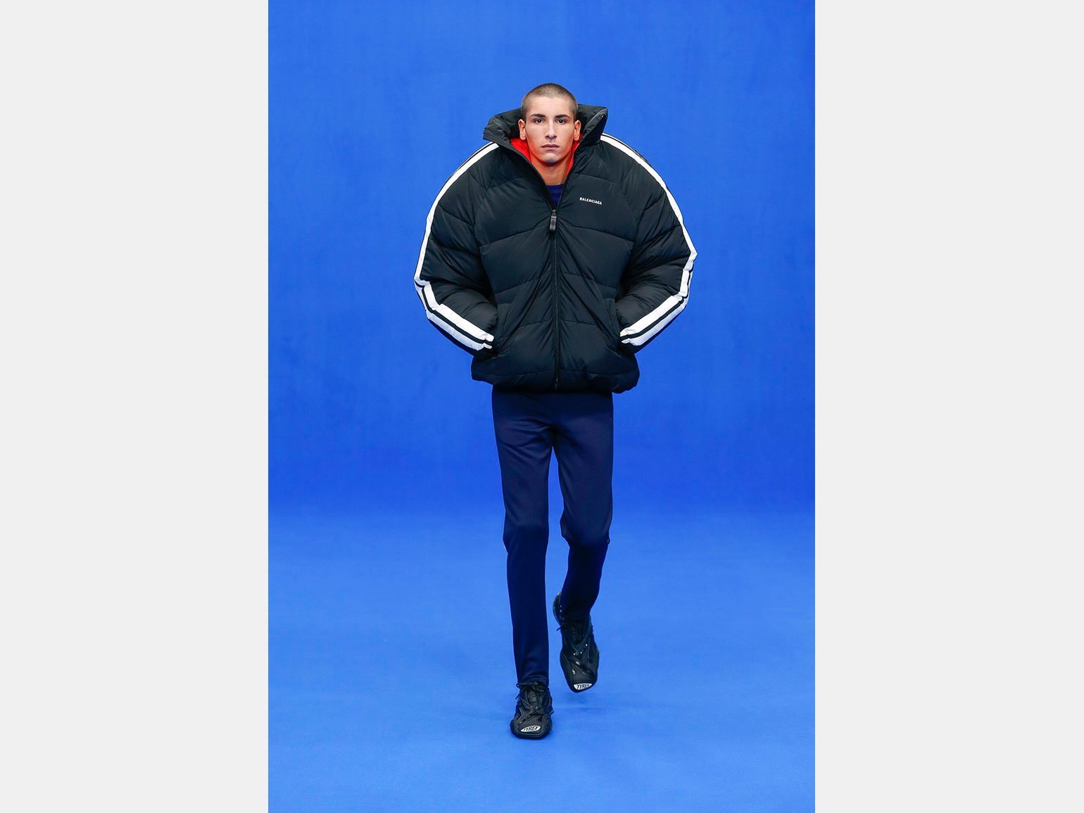 Очень объёмные пуховики и куртки стали знаковыми вещами бренда. При этом акцент в районе плеч и шеи и силуэт, будто создающий пьедестал для головы, — это ясная отсылка к тому, что создавал сам основатель модного домаФото: Balenciaga
