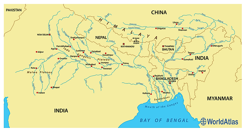 The Ganges Delta is the largest river delta draining into the Bay of Bengal. It is also the world’s largest river delta and comprises several river systems, including the Ganges River and Brahmaputra River. 60% of the river delta is in Bangladesh and the rest in India. The Ganges River is 2,704 km long and originates from the Western Himalayas. Brahmaputra River is 4,696 km long and also originates from the Himalayas.