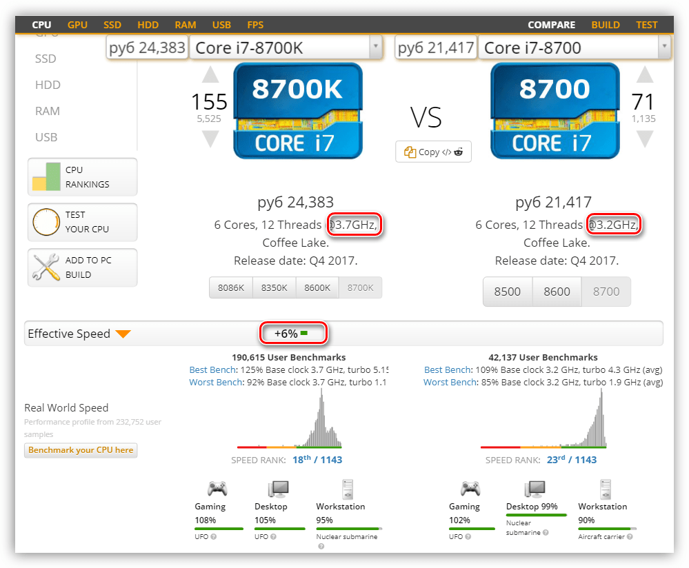 Здесь все предельно просто. Во всех приложениях и при любых сценариях использования величина ТЧ в значительной мере влияет на производительность процессора. Чем больше гигагерц, тем быстрее он работает. Например, шестиядерный «камень» с 3.7 GHz будет быстрее аналогичного, но с 3.2 GHz.