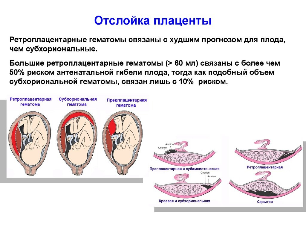 Это состояние имеет прогрессию пропорционально увеличению площади отслойки детского места. Признаки гипоксии проявляются, если плацента отслоилась в среднем более чем на ¼ от общей площади. Если отслоение произошло более 1/3 поверхности, плод испытывает кислородную недостаточность. Поражение более 50% хориона зачастую приводит к гибели плода внутри утробы.