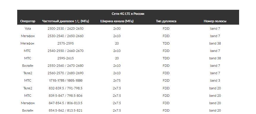 Технология LTE работает на разных частотных диапазонах (BAND, или бэнд). Для FDD выделяются несколько бэндов: 1, 3, 7, 20, в свою очередь для TDD — 33, 38, 40 и 44. В России мобильные операторы используют следующие: