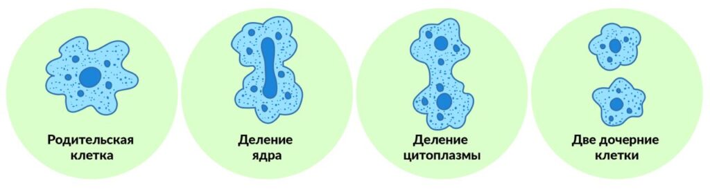 Для большинства простейших характерно бесполое размножение — деление клетки надвое (митоз). Например, тело амебы как бы перетягивается, и все органеллы делятся надвое.