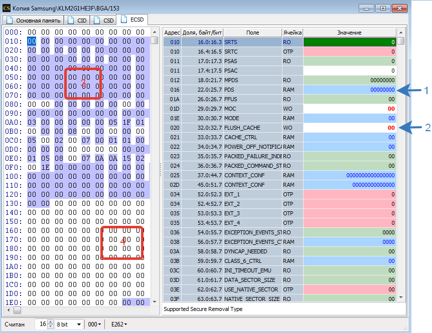 - ECSD (Extended CSD register) — расширенный регистр управления микросхемой.