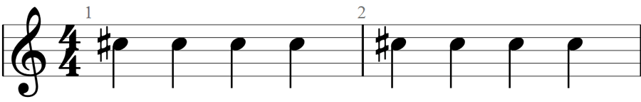 В приведенном выше примере вы можете увидеть, что существует восемь нот C #. Четыре в первом такте и четыре во втором. Знак диеза пишется только один раз на такт в первой ноте C#. Во второй раз, когда вы видите ноту C, это означает, что вы должны сыграть ее как C#.
