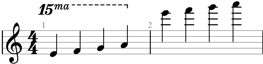 В приведенном ниже примере вы можете видеть, что над нотным станом написано “8va” и пунктирная линия.