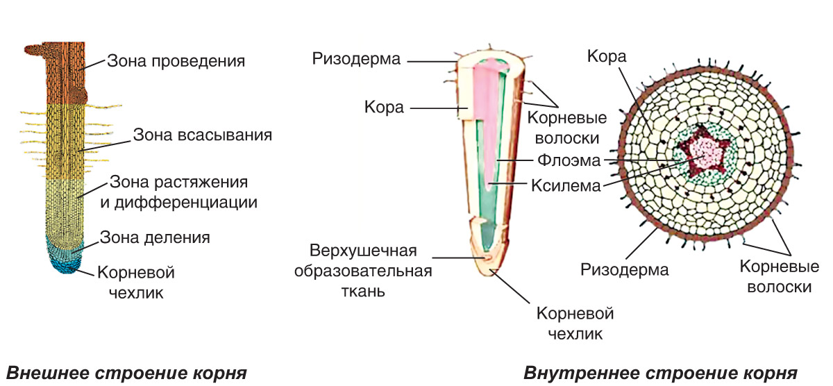 При рассмотрении молодого корня в микроскоп на нем можно заметить отдельные участки: корневой чехлик, зону деления, зону растяжения и дифференциации, зону всасывания, зону проведения (см. рис. Внешнее строение). Корневой чехлик расположен на кончике корня и защищает верхушечную меристему в зоне деления от механических повреждений. Корневой чехлик — это признак корня, позволяющий отличить его от подземных побегов. Зона деления окружена корневым чехликом и состоит из клеток верхушечной меристемы, из которых образуются клетки всех тканей корня. Зона растяжения и дифференциации расположена над зоной деления. Ее еще называют зоной роста, поскольку в этой зоне клетки удлиняются и обеспечивают рост корня в длину. В конце этой зоны одинаковые клетки постепенно дифференцируются на клетки тканей. Зона всасывания (зона корневых волосков) находится над зоной роста, и в ней выделяются ткани. Покровная ткань представлена эпидермисом, клетки которого образуют корневые волоски. Эпидермис с корневыми волосками называется ризодермой. Корневые волоски осуществляют функцию всасывания воды и минеральных веществ из почвы. Зона проведения следует за зоной всасывания и обеспечивает продвижение поглощенных корнем воды и минеральных веществ в надземные части растения. В этой зоне отсутствуют корневые волоски, а у многолетних древесных растений эпидермис со временем заменяется перидермой. В зоне проведения образуются боковые корни за счет деления клеток боковой меристемы — перицикла.