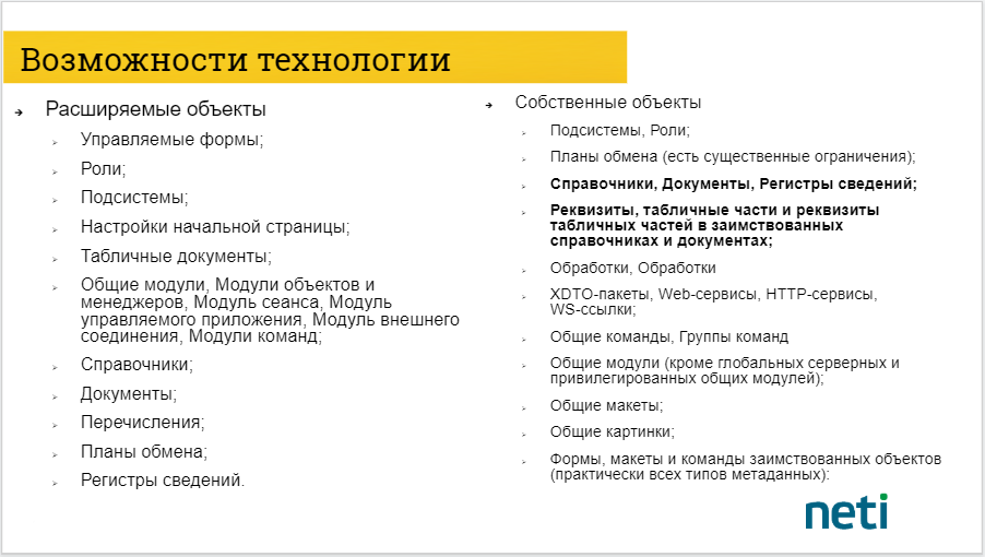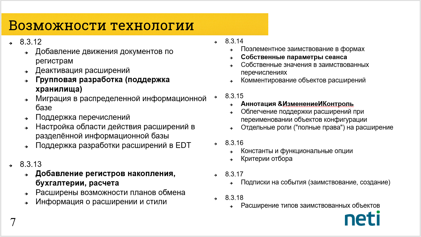 - в 8.3.18 — возможность расширения состава типов заимствованных объектов (с некоторыми исключениями, например, для определяемого типа).