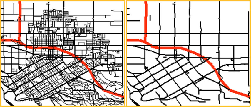 Размер, масштаб и носитель – физический размер карты относительно отображаемой на ней территории диктует масштаб карты и определяет, как вы будете представлять реальный размер и количество показанных на карте пространственных объектов. Сбор данных нередко осуществляется для определённого масштаба представления. Однако, если вы не отображаете данные в таких масштабах, убедитесь хотя бы, что они вам подходят. Например, оцифрованные в масштабе 1:50000 дороги будут гораздо более детальными, чем требуется для мелкомасштабных карт (например, 1:2 000 000), так что количество дорог на карте надо будет сокращать. Как видно на рис. 1, «прочищенная» (генерализированная) карта дорог (справа) читается гораздо лучше, чем карта слева – иногда бывает лучше, если показано меньше объектов.