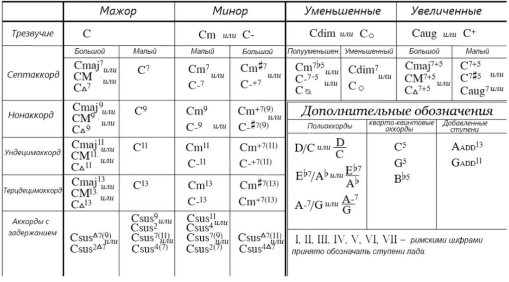 - Если аккорд имеет дополнительные добавочные ступени, то после аккорда добавляется цифра такой ступени.