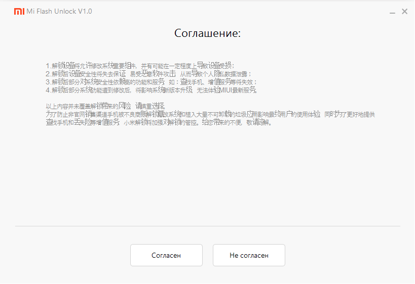 - Заходим в утилиту Mi Flash Unlock, видим окно с заголовком «Отказ от ответственности», соглашаемся с правилами.