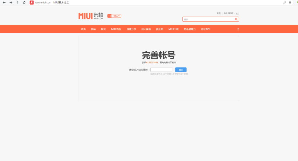 В некоторых случаях вместо страницы загрузки может открыться страница на китайском языке с полем для ввода по центру. В это поле нужно вписать никнейм для форума MIUI: придумайте ник, переведите его на китайский в любом онлайн-переводчике и вставьте в форму.