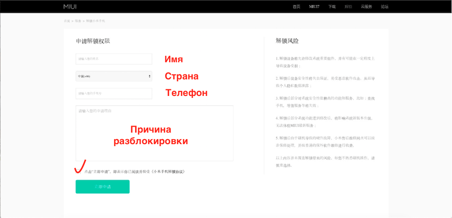 Данные нужно вводить на английском языке если открылась английская версия, если язык китайский, то все на китайском, стоит воспользоваться переводчиком. В поле «Причина» можно ввести следующее: «Хочу установить на смартфон xiaomi mi4 прошивку с русским языком». Модель телефона указываем собственную.