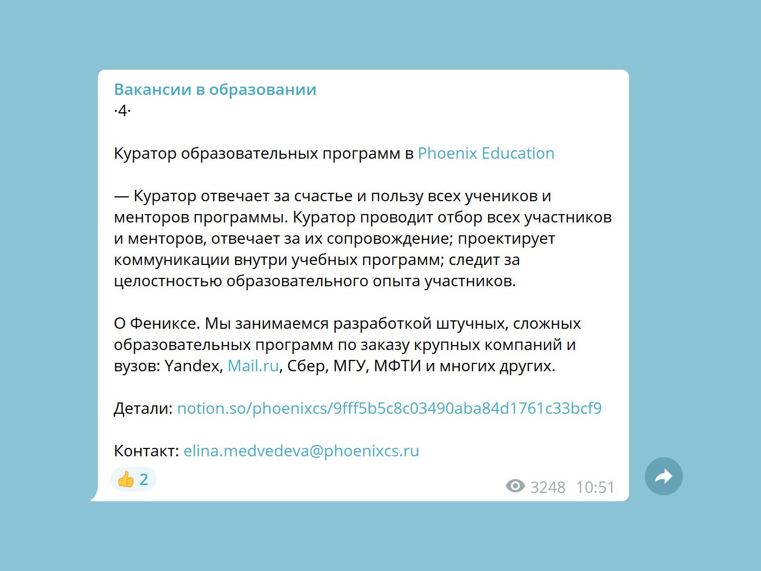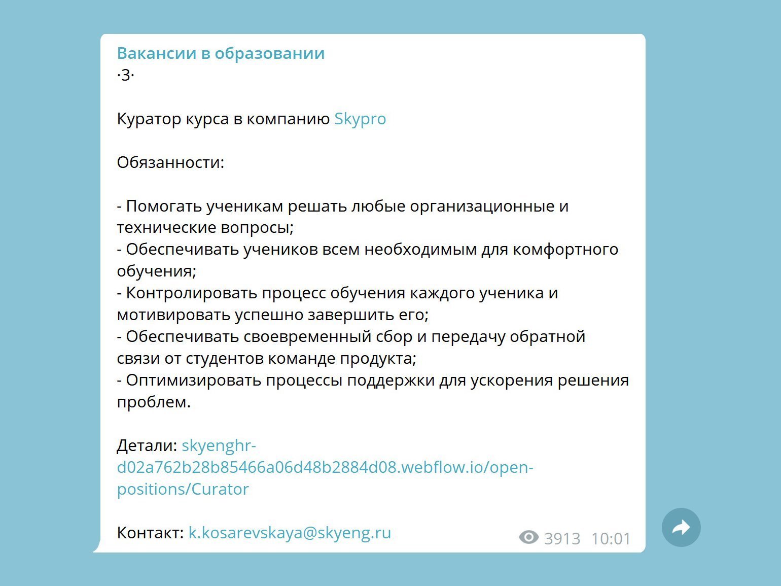 Требования, которые предъявляют работодатели к кандидатам на должность куратораСкриншот: Telegram-канал «Вакансии в образовании»