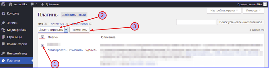 - В выпадающем списке указать опцию «Деактивировать» (стрелка № 2).