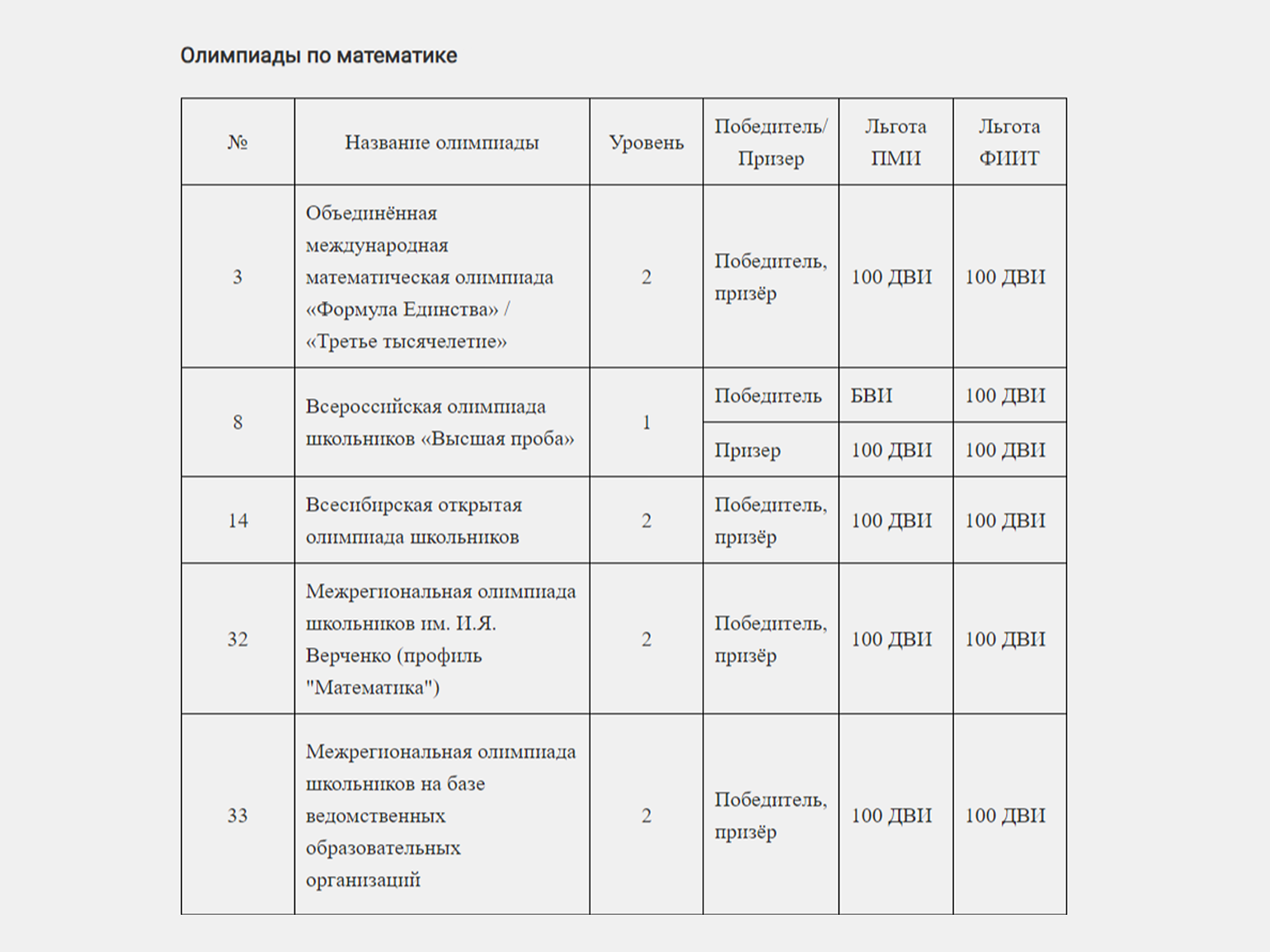 Вот, например, как выглядит фрагмент длинного списка перечневых олимпиад и прав, которые дают победы и призовые места в них при поступлении на факультет вычислительной математики и кибернетики в МГУ (в основном можно получить 100 баллов за ДВИ, то есть дополнительные вступительные испытания по математике, но за победы в некоторых полагается БВИ, то есть приоритетный приём без вступительных испытаний):