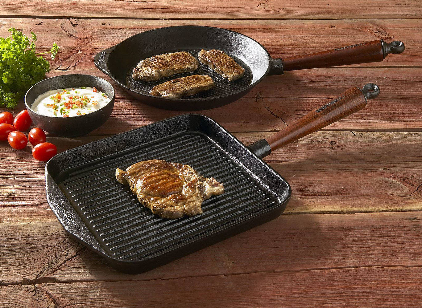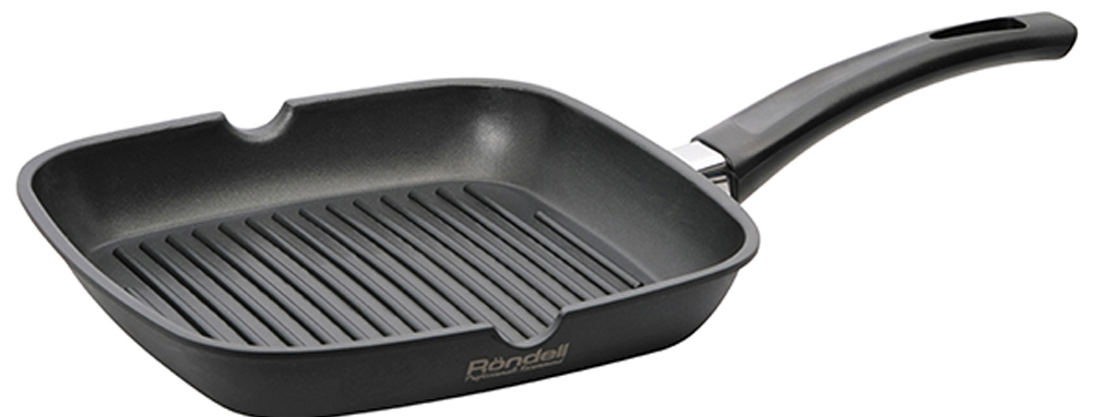 Компактная квадратная сковорода гриль с удлиненной рукояткой. Эксперты отмечают, что благодаря ей утварь легко поднимается с плиты даже полностью заполненная стейками. Материал рукоятки — бакелит.