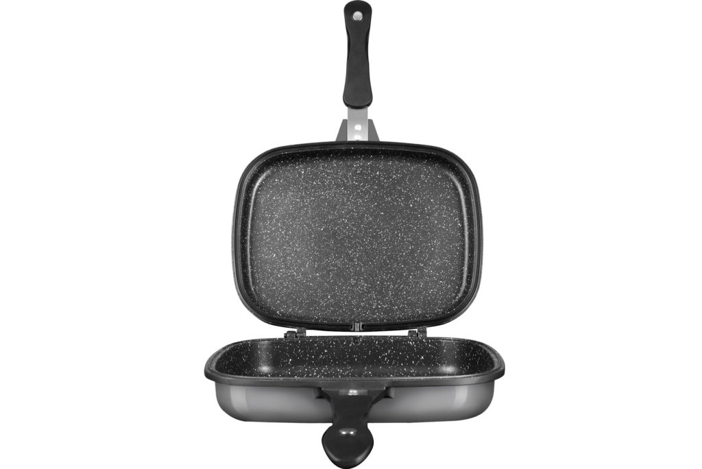 Модель состоит из двух скрепленных друг с другом сковородок с рукоятками из термостойкого пластика. Соединение разъемное.