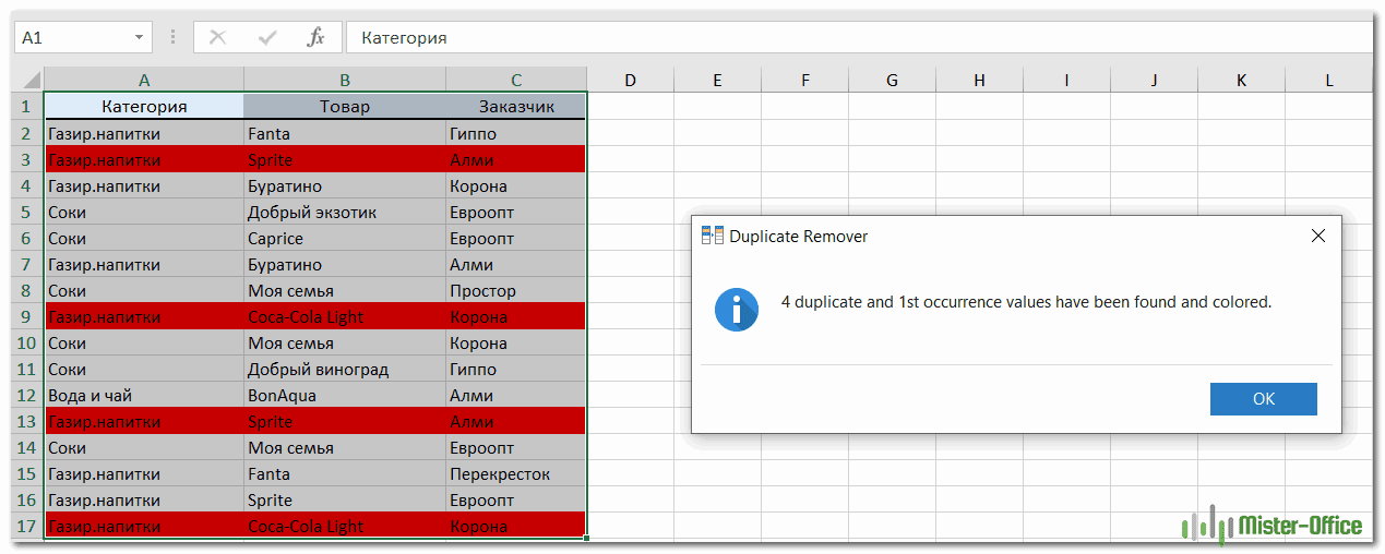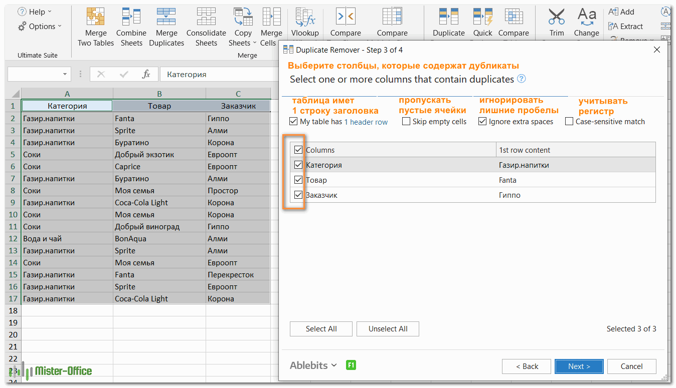 - Выберите столбцы для проверки дубликатов (в данном примере это все 3 столбца – категория, товар и заказчик).