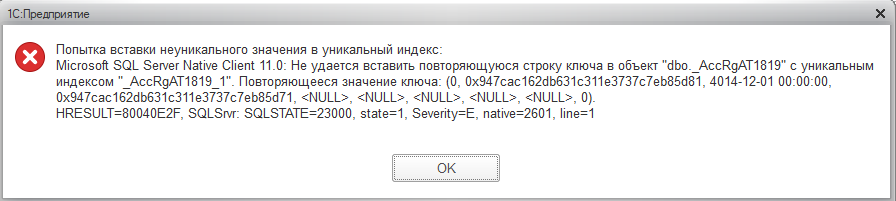 Ошибка вставки не уникального значения была на таблице “_AccRgAT1819”, а эта таблица итогов по счетам с субконто 1. Пока это ничего не дает, рассмотрим варианты решения.