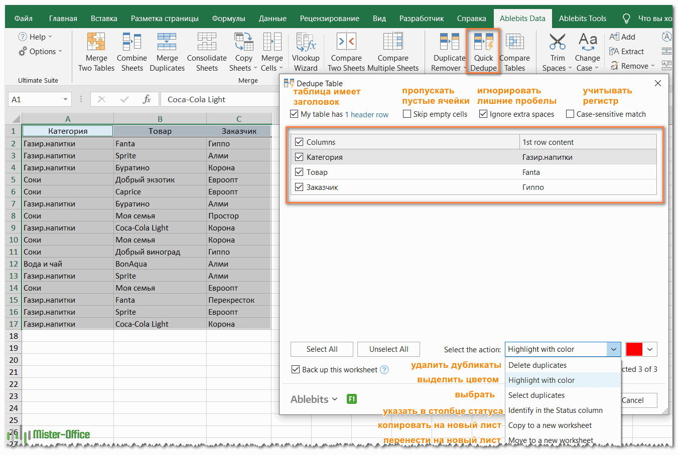 Сначала посмотрим в работе наиболее простой инструмент — быстрый поиск дубликатов Quick Dedupe. Используем уже знакомую нам таблицу, в которой мы выше искали дубликаты при помощи формул: