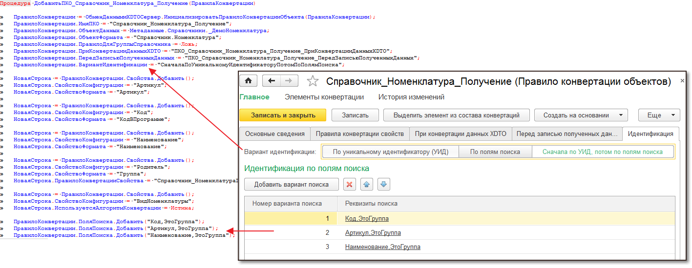 Вариант автоматического сопоставления (идентификации) объектов при получении задается с помощью свойства ВариантИдентификации ПКО и может принимать одно из трех значений: