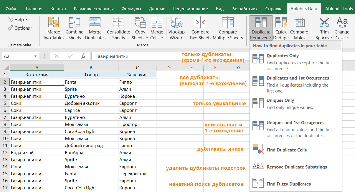 Если вам нужны дополнительные возможности для работы с дубликатами и уникальными значениями, используйте мастер удаления дубликатов Duplicate Remover, который может найти дубликаты с первыми вхождениями или без них, а также уникальные значения. Подробные инструкции приведены ниже.