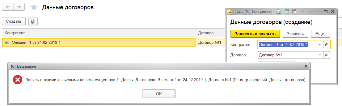 Если попытаться записать в него данные с повторяющимися значениями контрагента и договора, то мы поймаем такую ошибку.