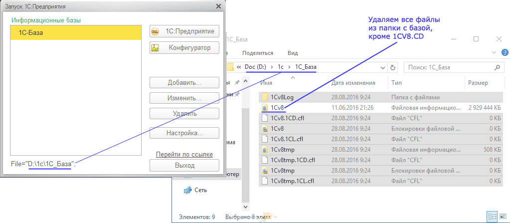 Для этого необходимо зайти и удалить все файлы и папки, КРОМЕ ФАЙЛА ДАННЫХ 1Cv8.CD