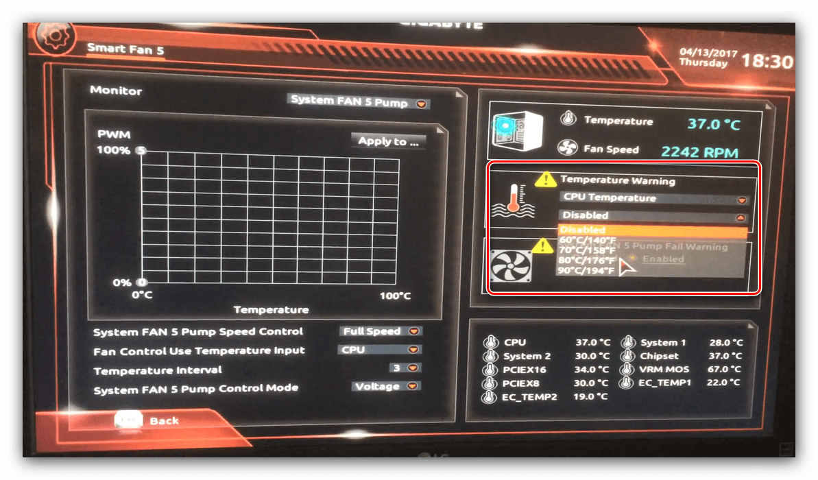 Также в платы рассматриваемого производителя встроено средство защиты компонентов компьютера от перегрева: при достижении порогового значения температуры пользователь получит оповещение о необходимости выключения машины. Настроить отображение этих уведомлений можно в разделе «Smart Fan 5», упомянутом на предыдущем этапе.