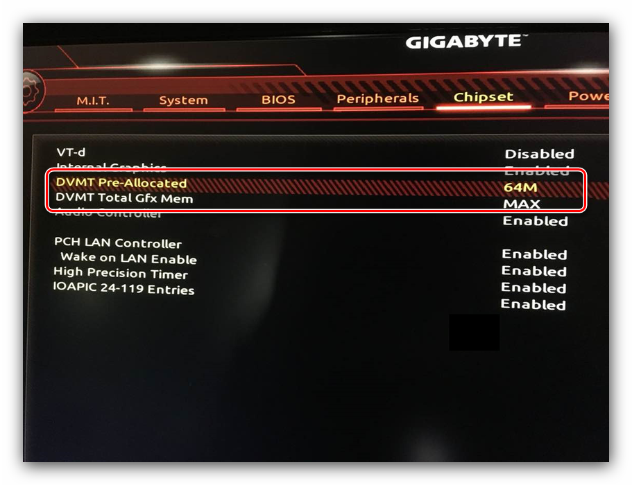 В разделе «Chipset» можно либо полностью отключить встроенную графику для снижения нагрузки на CPU (опция «Internal Graphics» в положении «Disabled»), либо увеличить или уменьшить объём оперативной памяти, которая потребляется этим компонентом (опции «DVMT Pre-Allocated» и «DVMT Total Gfx Mem»)