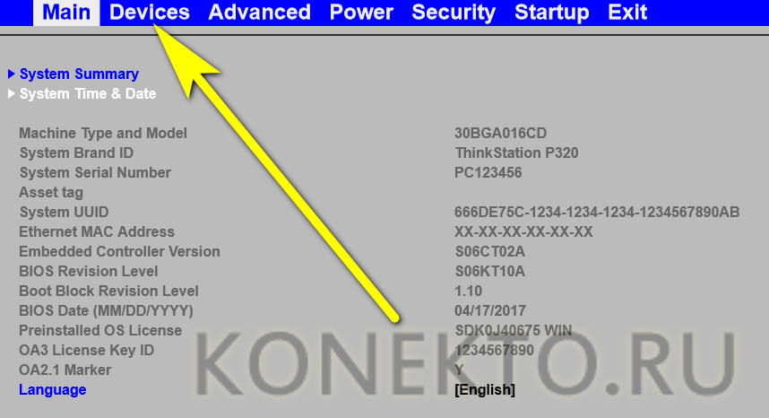 Теперь нужно выйти в БИОС и переключиться на следующую вкладку — обычно ею оказываются Devices, или «Устройства».