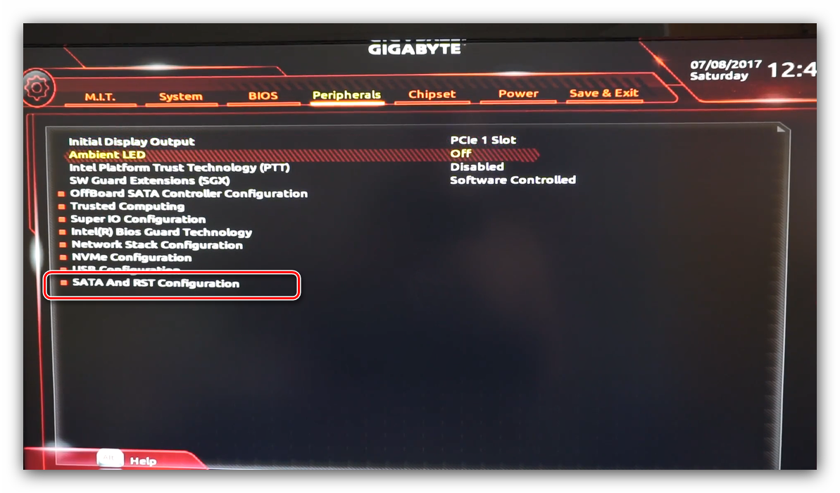 Режим AHCI, необходимый для современных HDD и SSD, включается на вкладке «Peripherals», в разделах «SATA and RST Configuration» – «SATA Mode Selection».