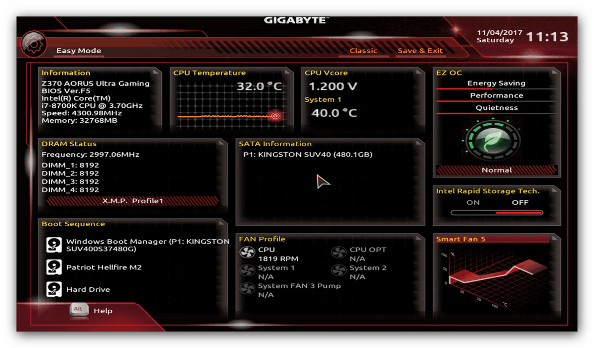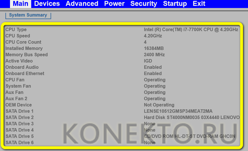 Пользователь увидит на экране сведения об оперативной памяти, количестве подключённых жёстких дисков, центральном процессоре, функционировании вентиляторов и так далее.