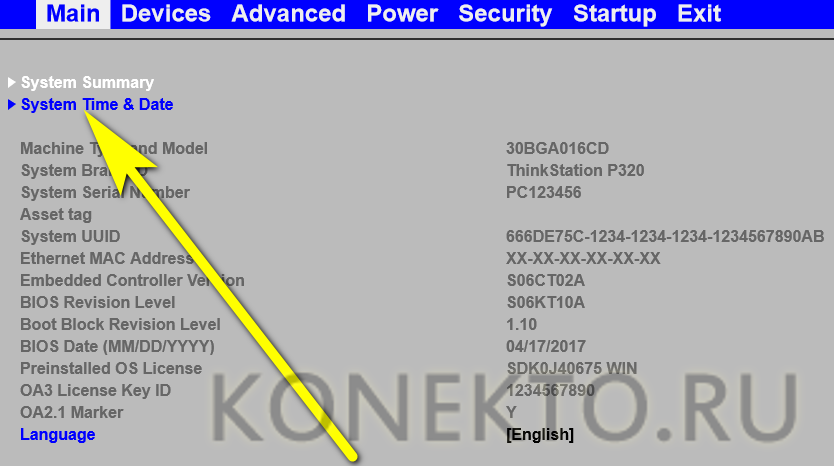 На вкладке Main юзеру доступны следующие манипуляции с BIOS: