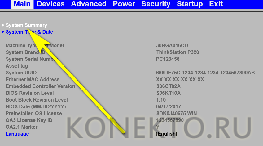 На этой вкладке, в зависимости от модификации BIOS, представлены следующие справочные данные о компьютере или ноутбуке: