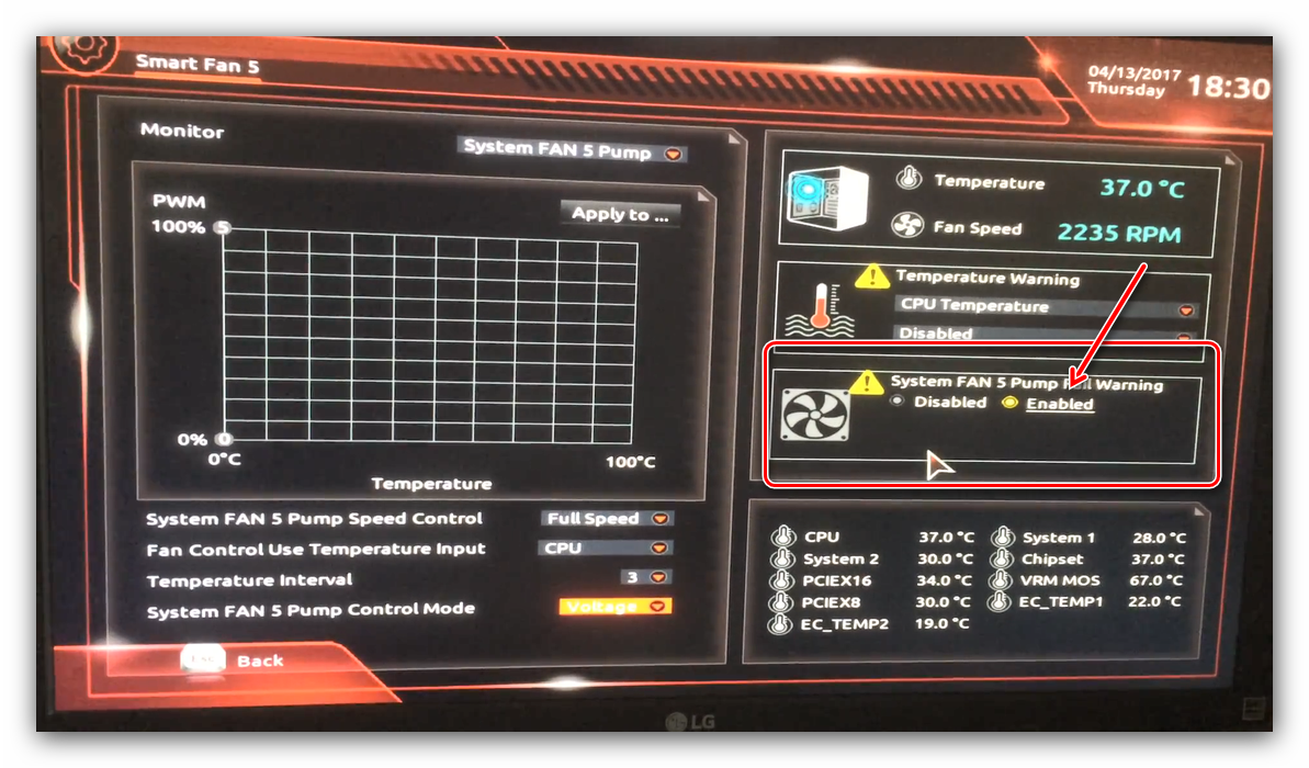 Также в платы рассматриваемого производителя встроено средство защиты компонентов компьютера от перегрева: при достижении порогового значения температуры пользователь получит оповещение о необходимости выключения машины. Настроить отображение этих уведомлений можно в разделе «Smart Fan 5», упомянутом на предыдущем этапе.