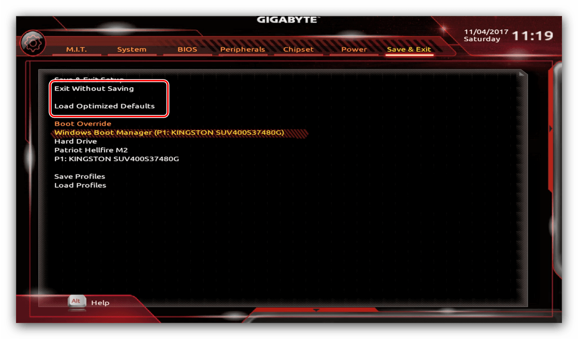 Также можно выйти без сохранения (если не уверены, что ввели всё правильно), используйте опцию «Exit Without Saving», или сбросить настройки БИОС к заводским, за что отвечает вариант «Load Optimized Defaults».