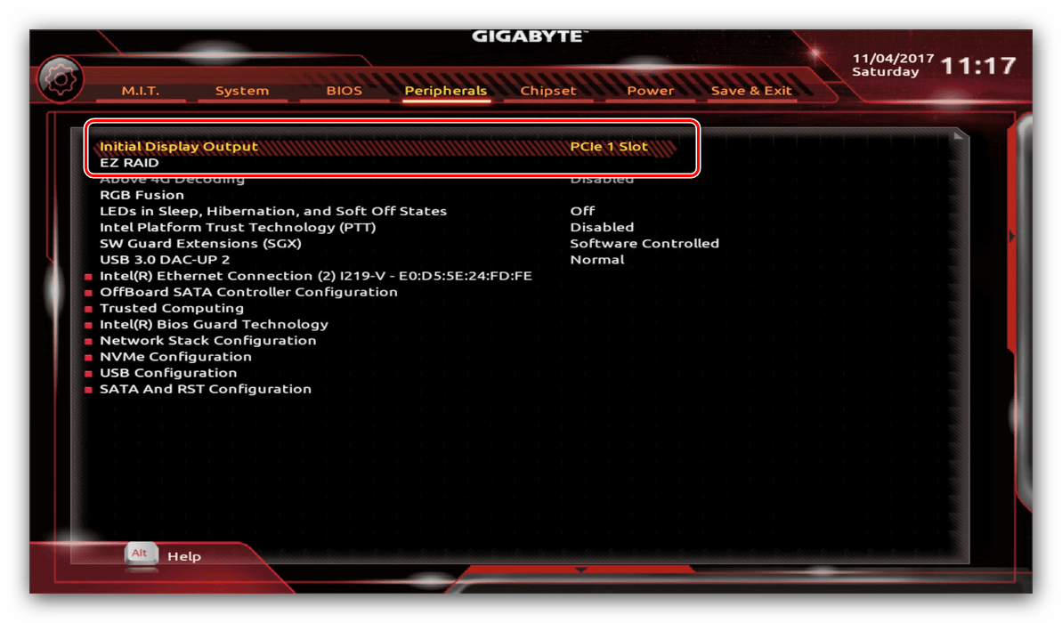 Через UEFI BIOS плат Gigabyte можно настроить работу компьютера с видеоадаптерами. Для этого перейдите на вкладку «Peripherals».