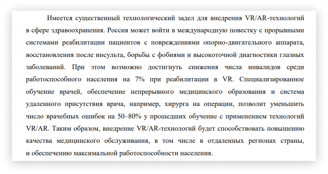 Что касается российского рынка VR/AR-решений для медицины, то на данный момент его оценка проводилась только в рамках подготовки дорожной карты нацпрограммы «Цифровая экономика». В документе говорится о высоком потенциале отечественных разработчиков, а сфера здравоохранения считается одной из приоритетных отраслей применения VR/AR наравне с образованием, промышленностью и потребительскими сервисами.