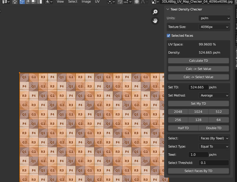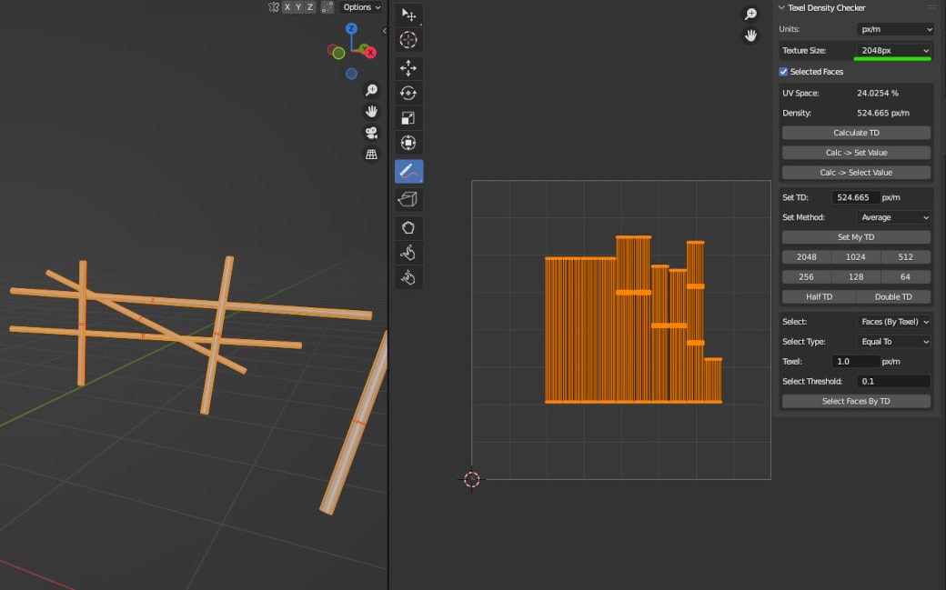 We could approximate the texel density for each of the elements based on our checker mapped ground plane, but that would be tedious and thanks to the work of Ivan Vostrikov, unnecessary! Instead, we’ll use his handy Texel Density Checker addon, which is available for free, but certainly worth leaving a donation for!