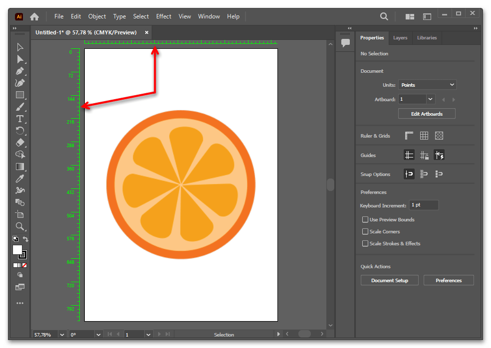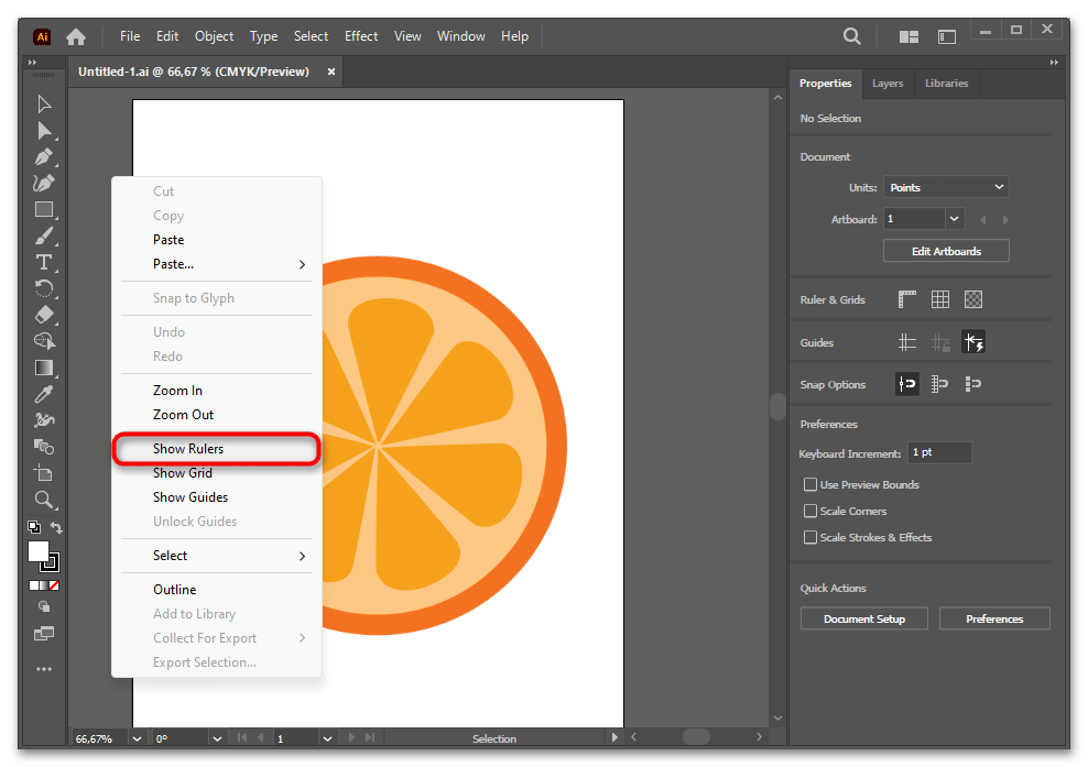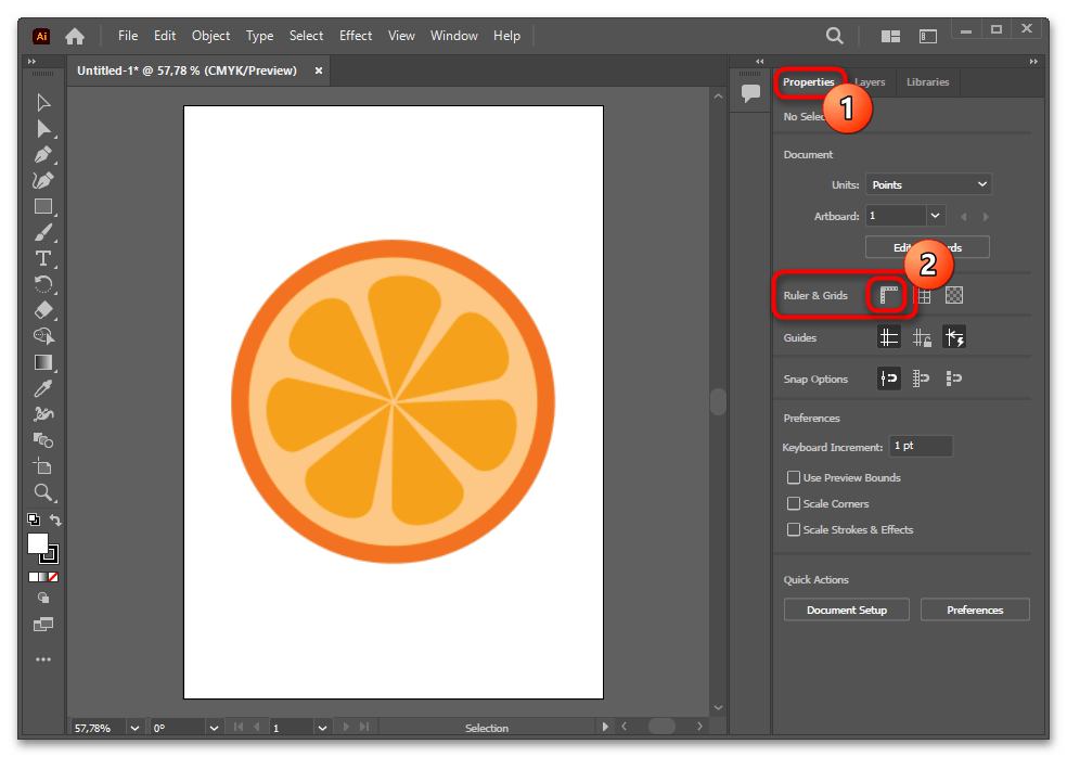 Если вам удобнее пользоваться панелью свойств и у вас добавлено окно «Properties» («Свойства»), включите линейку через нее. Находится она в блоке «Ruler & Grids» («Линейка и сетки»). При отсутствии таких параметров внутри окна снимите выделение с объекта на холсте.