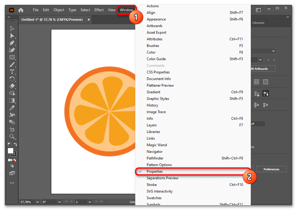 Для добавления этого окна и быстрого включения и отключения линеек, направляющих, сетки на панели меню вызовите «Window» («Окно») и включите «Properties» («Свойства»).