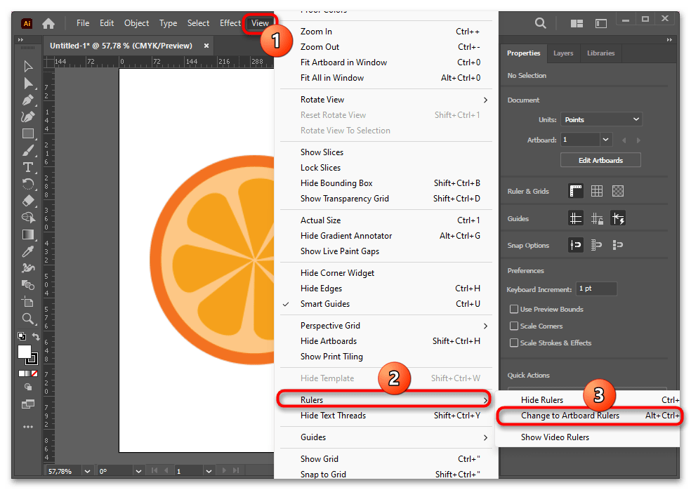 Для переключения между ими и общими линейками зайдите в это же меню и выберите «Change to Global Rulers» («Сменить на общие линейки») либо «Change to Artboard Rulers» («Сменить на линейки монтажной области»).
